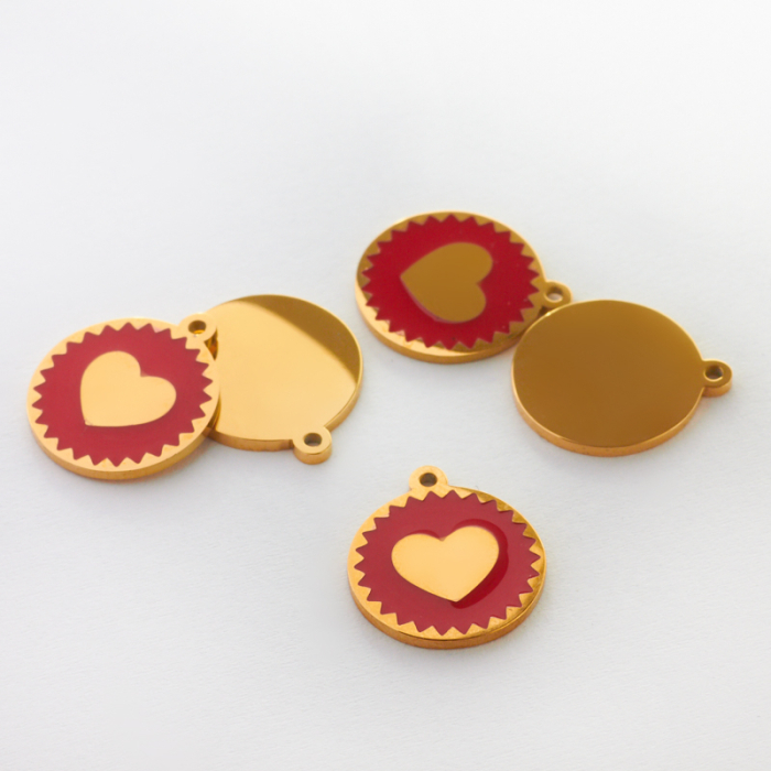 Zawieszka emaliowana kółko ze stali chirurgicznej w kolorze złotym serce czerwone 13mmTo trwały element biżuterii lub półfabrykat jubilerski, który dobrze sprawdza się w codziennych realizacjach. Stal chirurgiczna 316L dobrze sprawdza się w biżuterii noszonej na co dzień, ponieważ łączy trwałość z estetycznym wykończeniem.Zawieszka ze stali chirurgicznej 316L to dekoracyjny element, który nadaje biżuterii charakteru i pozwala tworzyć spersonalizowane projekty. Świetnie sprawdza się w naszyjnikach, bransoletkach, kolczykach oraz drobnych charmsach.Forma lub motyw