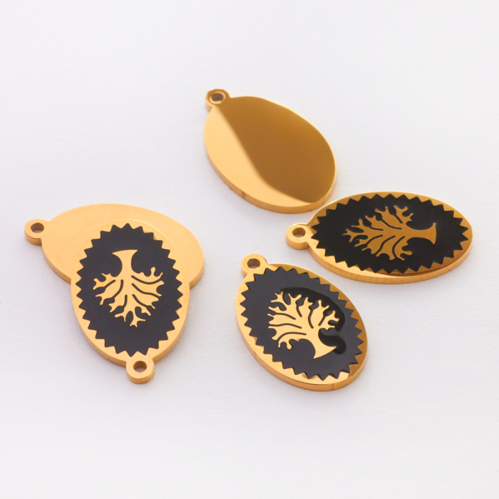 Zawieszka emaliowana owal ze stali chirurgicznej w kolorze złotym drzewo rodziny czarne 17,7mmTo trwały element biżuterii lub półfabrykat jubilerski, który dobrze sprawdza się w codziennych realizacjach. Stal chirurgiczna 316L dobrze sprawdza się w biżuterii noszonej na co dzień, ponieważ łączy trwałość z estetycznym wykończeniem.Zawieszka ze stali chirurgicznej 316L to dekoracyjny element, który nadaje biżuterii charakteru i pozwala tworzyć spersonalizowane projekty. Świetnie sprawdza się w naszyjnikach, bransoletkach, kolczykach oraz drobnych charmsach.Forma lub motyw