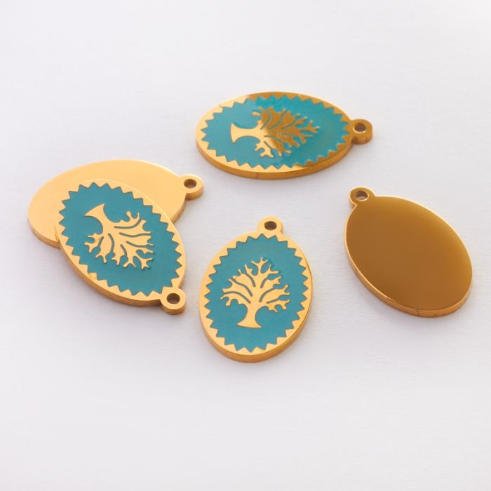 Zawieszka emaliowana owal ze stali chirurgicznej w kolorze złotym drzewo rodziny turkusowe 17,7mm