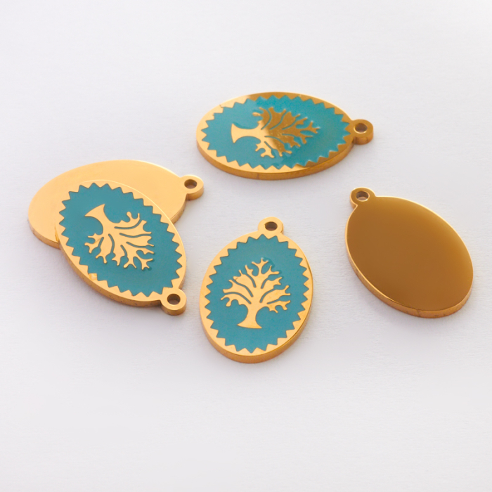 Zawieszka emaliowana owal ze stali chirurgicznej w kolorze złotym drzewo rodziny turkusowe 17,7mmTo starannie wykonany produkt ze stali chirurgicznej 316L, który dobrze prezentuje się w codziennym użytkowaniu. W biżuterii handmade stal chirurgiczna 316L jest ceniona za dobry wygląd, odporność na korozję i wygodę codziennego użytkowania.Zawieszka ze stali chirurgicznej 316L to dekoracyjny element, który nadaje biżuterii charakteru i pozwala tworzyć spersonalizowane projekty. Świetnie sprawdza się w naszyjnikach, bransoletkach, kolczykach oraz drobnych charmsach.Forma lub motyw