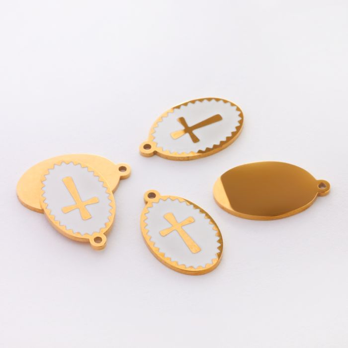 Zawieszka emaliowana owal ze stali chirurgicznej w kolorze złotym krzyż biały 17,7mm