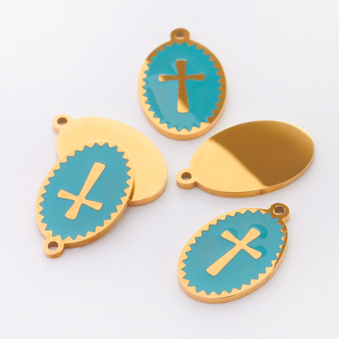 Zawieszka emaliowana owal ze stali chirurgicznej w kolorze złotym krzyż turkusowy 17,7mmTo dopracowany produkt ze stali chirurgicznej 316L, który łączy praktyczność z estetycznym wyglądem. Stal chirurgiczna 316L dobrze sprawdza się w biżuterii noszonej na co dzień, ponieważ łączy trwałość z estetycznym wykończeniem.Zawieszka ze stali chirurgicznej 316L to dekoracyjny element, który nadaje biżuterii charakteru i pozwala tworzyć spersonalizowane projekty. Świetnie sprawdza się w naszyjnikach, bransoletkach, kolczykach oraz drobnych charmsach.Forma lub motyw