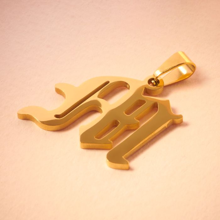 Zawieszka literka gotycka M ze stali chirurgicznej z krawatką w kolorze złotym 23mm