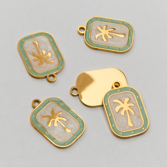 Zawieszka ze stali chirurgicznej emaliowana z palmą w kolorze złotym 19,5mm PVDTo starannie wykonany produkt ze stali szlachetnej, który dobrze prezentuje się w codziennym użytkowaniu. W biżuterii handmade stal szlachetna jest ceniona za dobry wygląd, odporność na korozję i wygodę codziennego użytkowania. Wykończenie w kolorze złotym uzyskane metodą PVD.Zawieszka ze stali szlachetnej to dekoracyjny element, który nadaje biżuterii charakteru i pozwala tworzyć spersonalizowane projekty. Świetnie sprawdza się w naszyjnikach, bransoletkach, kolczykach oraz drobnych charmsach.Forma lub motyw