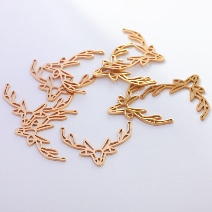 Zawieszka ze stali chirurgicznej głowa jelenia w kolorze złotym 24x30mmTo starannie wykonany produkt ze stali chirurgicznej 316L, który dobrze prezentuje się w codziennym użytkowaniu. To materiał chętnie wybierany do biżuterii handmade ze względu na trwałość, estetykę i wygodę użytkowania.Zawieszka ze stali chirurgicznej 316L to dekoracyjny element, który nadaje biżuterii charakteru i pozwala tworzyć spersonalizowane projekty. Świetnie sprawdza się w naszyjnikach, bransoletkach, kolczykach oraz drobnych charmsach.Forma lub motyw