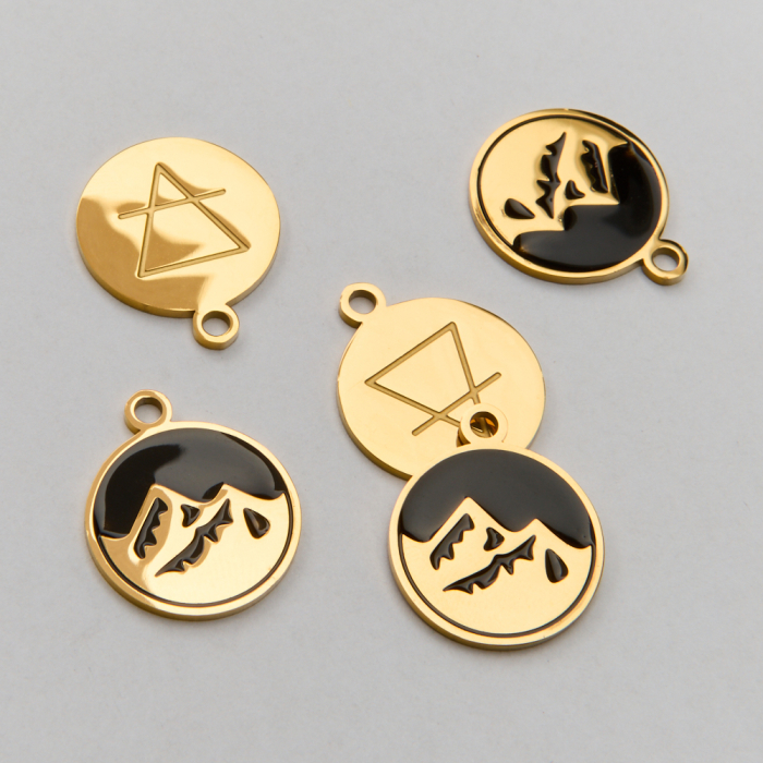 Zawieszka ze stali chirurgicznej góry na emaliowanym czarnym tle w kolorze złotym 18mm PVDTo starannie wykonany produkt ze stali chirurgicznej 316L, który dobrze prezentuje się w codziennym użytkowaniu. To materiał chętnie wybierany do biżuterii handmade ze względu na trwałość, estetykę i wygodę użytkowania. Wykończenie w kolorze złotym uzyskane metodą PVD.Zawieszka ze stali chirurgicznej 316L to dekoracyjny element, który nadaje biżuterii charakteru i pozwala tworzyć spersonalizowane projekty. Świetnie sprawdza się w naszyjnikach, bransoletkach, kolczykach oraz drobnych charmsach.Forma lub motyw