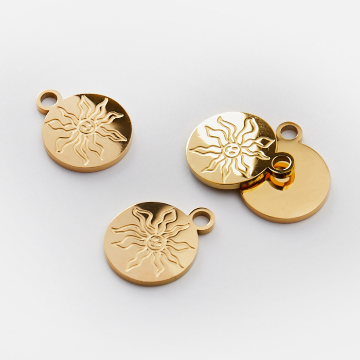 Zawieszka ze stali chirurgicznej grawerowana kółko ze słoneczkiem w kolorze złotym 13,5mm PVDTo starannie wykonany produkt ze stali chirurgicznej 316L, który dobrze prezentuje się w codziennym użytkowaniu. Stal chirurgiczna 316L jest ceniona za odporność na korozję i estetyczny wygląd w codziennym użytkowaniu. Wykończenie w kolorze złotym uzyskane metodą PVD.Zawieszka ze stali chirurgicznej 316L to dekoracyjny element, który nadaje biżuterii charakteru i pozwala tworzyć spersonalizowane projekty. Świetnie sprawdza się w naszyjnikach, bransoletkach, kolczykach oraz drobnych charmsach.Forma lub motyw