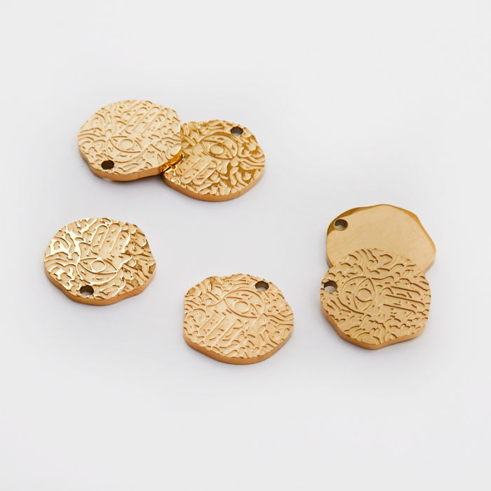 Zawieszka ze stali chirurgicznej grawerowana ręka fatimy w kółku w kolorze złotym 14,5mm PVDTo estetyczny element biżuteryjny ze stali chirurgicznej 316L, chętnie wybierany do nowoczesnych projektów. W biżuterii handmade stal chirurgiczna 316L jest ceniona za dobry wygląd, odporność na korozję i wygodę codziennego użytkowania. Wykończenie w kolorze złotym uzyskane metodą PVD.Zawieszka ze stali chirurgicznej 316L to dekoracyjny element, który nadaje biżuterii charakteru i pozwala tworzyć spersonalizowane projekty. Świetnie sprawdza się w naszyjnikach, bransoletkach, kolczykach oraz drobnych charmsach.Forma lub motyw