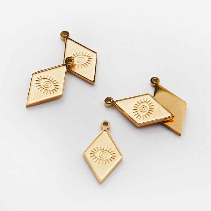 Zawieszka ze stali chirurgicznej grawerowana romb z okiem proroka w kolorze złotym 16mm PVD