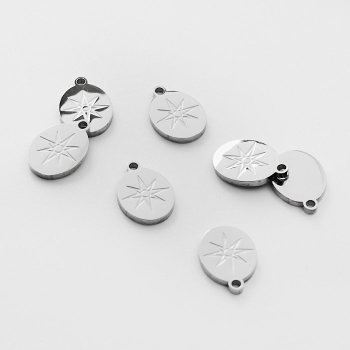 Zawieszka ze stali chirurgicznej grawerowana róża wiatrów w owalu w kolorze srebrnym 13mmTo starannie wykonany produkt ze stali szlachetnej, który dobrze prezentuje się w codziennym użytkowaniu. Stal szlachetna dobrze sprawdza się w biżuterii noszonej na co dzień, ponieważ łączy trwałość z estetycznym wykończeniem.Zawieszka ze stali szlachetnej to dekoracyjny element, który nadaje biżuterii charakteru i pozwala tworzyć spersonalizowane projekty. Świetnie sprawdza się w naszyjnikach, bransoletkach, kolczykach oraz drobnych charmsach.Forma lub motyw
