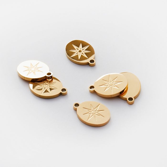 Zawieszka ze stali chirurgicznej grawerowana róża wiatrów w owalu w kolorze złotym 13mm PVD