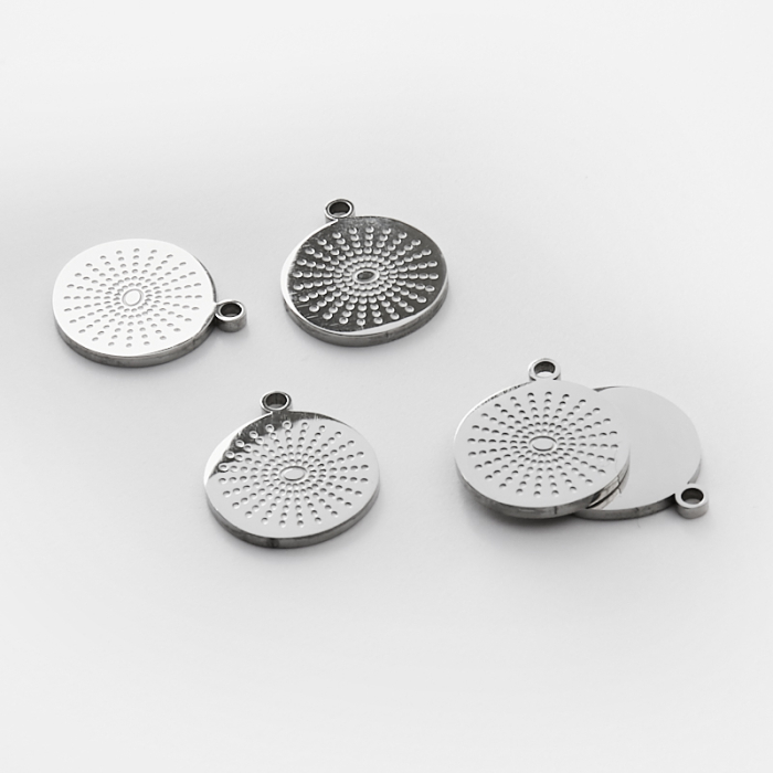 Zawieszka ze stali chirurgicznej grawerowana słońce w kropeczki w asymetrycznym kółku w kolorze srebrnym 14,5mmTo starannie wykonany produkt ze stali szlachetnej, który dobrze prezentuje się w codziennym użytkowaniu. W biżuterii handmade stal szlachetna jest ceniona za dobry wygląd, odporność na korozję i wygodę codziennego użytkowania.Zawieszka ze stali szlachetnej to dekoracyjny element, który nadaje biżuterii charakteru i pozwala tworzyć spersonalizowane projekty. Świetnie sprawdza się w naszyjnikach, bransoletkach, kolczykach oraz drobnych charmsach.Forma lub motyw
