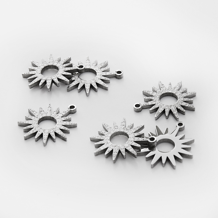 Zawieszka ze stali chirurgicznej grawerowana słoneczko wycięte w kolorze srebrnym 16,5mmTo trwały element biżuterii lub półfabrykat jubilerski, który dobrze sprawdza się w codziennych realizacjach. Stal chirurgiczna 316L dobrze sprawdza się w biżuterii noszonej na co dzień, ponieważ łączy trwałość z estetycznym wykończeniem.Zawieszka ze stali chirurgicznej 316L to dekoracyjny element, który nadaje biżuterii charakteru i pozwala tworzyć spersonalizowane projekty. Świetnie sprawdza się w naszyjnikach, bransoletkach, kolczykach oraz drobnych charmsach.Forma lub motyw