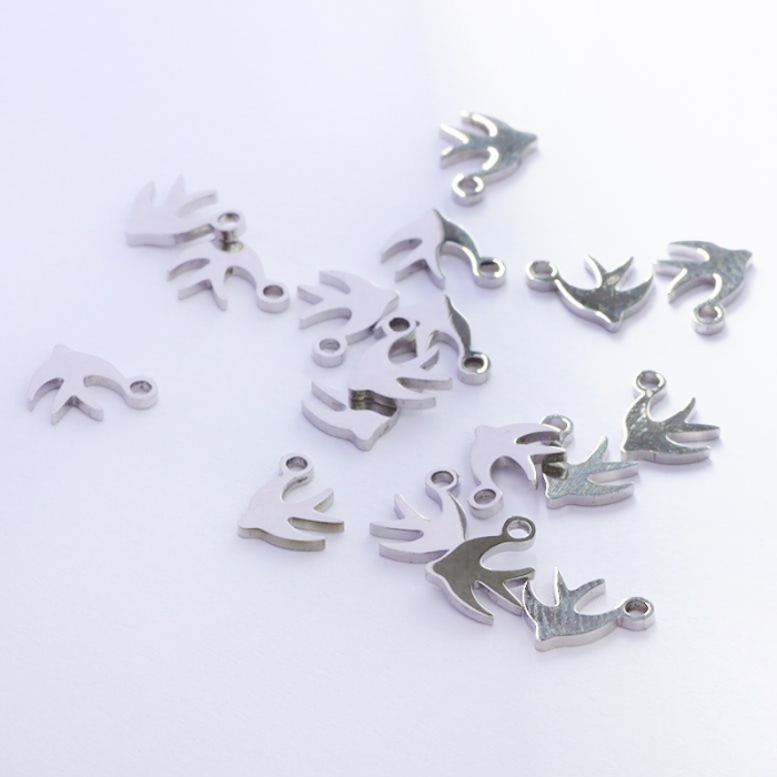 Zawieszka ze stali chirurgicznej jaskółka w kolorze srebrnym 9mmTo estetyczny element biżuteryjny ze stali chirurgicznej 316L, chętnie wybierany do nowoczesnych projektów. Stal chirurgiczna 316L dobrze sprawdza się w biżuterii noszonej na co dzień, ponieważ łączy trwałość z estetycznym wykończeniem.Zawieszka ze stali chirurgicznej 316L to dekoracyjny element, który nadaje biżuterii charakteru i pozwala tworzyć spersonalizowane projekty. Świetnie sprawdza się w naszyjnikach, bransoletkach, kolczykach oraz drobnych charmsach.Forma lub motyw