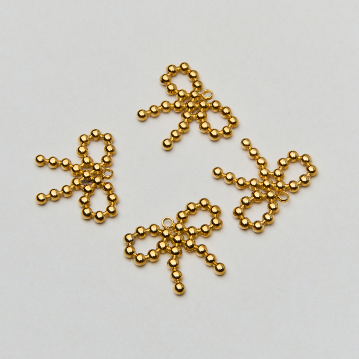Zawieszka ze stali chirurgicznej kokardka z kulek w kolorze złotym 19,5mm PVDTo estetyczny element biżuteryjny ze stali chirurgicznej 316L, chętnie wybierany do nowoczesnych projektów. To materiał chętnie wybierany do biżuterii handmade ze względu na trwałość, estetykę i wygodę użytkowania. Wykończenie w kolorze złotym uzyskane metodą PVD.Zawieszka ze stali chirurgicznej 316L to dekoracyjny element, który nadaje biżuterii charakteru i pozwala tworzyć spersonalizowane projekty. Świetnie sprawdza się w naszyjnikach, bransoletkach, kolczykach oraz drobnych charmsach.Forma lub motyw