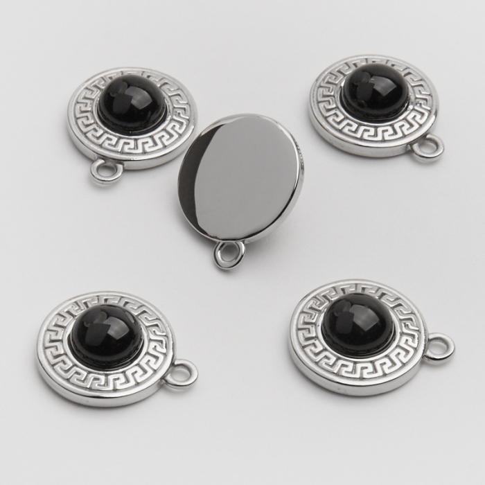 Zawieszka ze stali chirurgicznej kółko greckie z onyksem w kolorze srebrnym 19mmTo starannie wykonany produkt ze stali chirurgicznej 316L, który dobrze prezentuje się w codziennym użytkowaniu. Stal chirurgiczna 316L dobrze sprawdza się w biżuterii noszonej na co dzień, ponieważ łączy trwałość z estetycznym wykończeniem.Zawieszka ze stali chirurgicznej 316L to dekoracyjny element, który nadaje biżuterii charakteru i pozwala tworzyć spersonalizowane projekty. Świetnie sprawdza się w naszyjnikach, bransoletkach, kolczykach oraz drobnych charmsach.Forma lub motyw