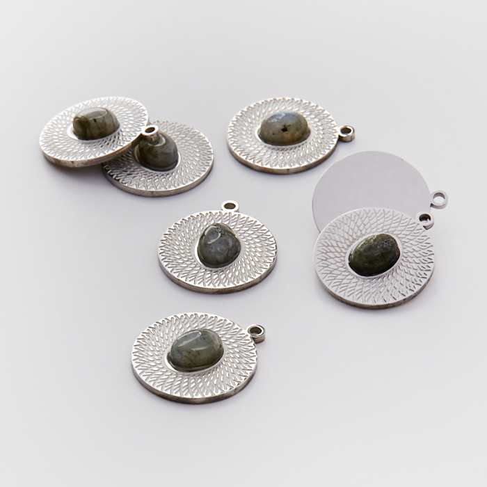 Zawieszka ze stali chirurgicznej kółko nacinane z labradorytem w kolorze srebrnym 21mmTo trwały element biżuterii lub półfabrykat jubilerski, który dobrze sprawdza się w codziennych realizacjach. To materiał chętnie wybierany do biżuterii handmade ze względu na trwałość, estetykę i wygodę użytkowania.Zawieszka ze stali chirurgicznej 316L to dekoracyjny element, który nadaje biżuterii charakteru i pozwala tworzyć spersonalizowane projekty. Świetnie sprawdza się w naszyjnikach, bransoletkach, kolczykach oraz drobnych charmsach.Forma lub motyw