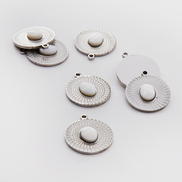 Zawieszka ze stali chirurgicznej kółko nacinane z masą perłową w kolorze srebrnym 21mmTo estetyczny element biżuteryjny ze stali chirurgicznej 316L, chętnie wybierany do nowoczesnych projektów. W biżuterii handmade stal chirurgiczna 316L jest ceniona za dobry wygląd, odporność na korozję i wygodę codziennego użytkowania.Zawieszka ze stali chirurgicznej 316L to dekoracyjny element, który nadaje biżuterii charakteru i pozwala tworzyć spersonalizowane projekty. Świetnie sprawdza się w naszyjnikach, bransoletkach, kolczykach oraz drobnych charmsach.Forma lub motyw