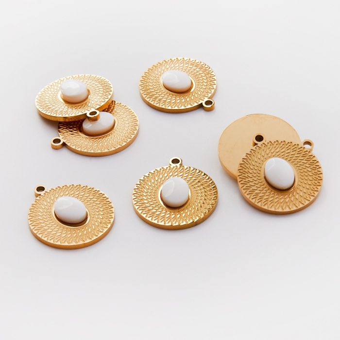 Zawieszka ze stali chirurgicznej kółko nacinane z masą perłową w kolorze złotym 21mm PVDTo dopracowany produkt ze stali szlachetnej, który łączy praktyczność z estetycznym wyglądem. To materiał chętnie wybierany do biżuterii handmade ze względu na trwałość, estetykę i wygodę użytkowania. Wykończenie w kolorze złotym uzyskane metodą PVD.Zawieszka ze stali szlachetnej to dekoracyjny element, który nadaje biżuterii charakteru i pozwala tworzyć spersonalizowane projekty. Świetnie sprawdza się w naszyjnikach, bransoletkach, kolczykach oraz drobnych charmsach.Forma lub motyw
