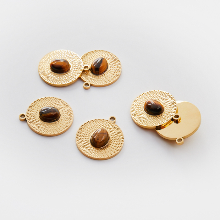 Zawieszka ze stali chirurgicznej kółko nacinane z tygrysim okiem w kolorze złotym 21mm PVDTo starannie wykonany produkt ze stali chirurgicznej 316L, który dobrze prezentuje się w codziennym użytkowaniu. W biżuterii handmade stal chirurgiczna 316L jest ceniona za dobry wygląd, odporność na korozję i wygodę codziennego użytkowania. Wykończenie w kolorze złotym uzyskane metodą PVD.Zawieszka ze stali chirurgicznej 316L to dekoracyjny element, który nadaje biżuterii charakteru i pozwala tworzyć spersonalizowane projekty. Świetnie sprawdza się w naszyjnikach, bransoletkach, kolczykach oraz drobnych charmsach.Forma lub motyw