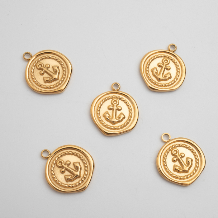 Zawieszka ze stali chirurgicznej kółko nieregularne z kotwicą w kolorze złotym 17,5mm PVDTo dopracowany produkt ze stali chirurgicznej 316L, który łączy praktyczność z estetycznym wyglądem. Stal chirurgiczna 316L dobrze sprawdza się w biżuterii noszonej na co dzień, ponieważ łączy trwałość z estetycznym wykończeniem. Wykończenie w kolorze złotym uzyskane metodą PVD.Zawieszka ze stali chirurgicznej 316L to dekoracyjny element, który nadaje biżuterii charakteru i pozwala tworzyć spersonalizowane projekty. Świetnie sprawdza się w naszyjnikach, bransoletkach, kolczykach oraz drobnych charmsach.Forma lub motyw