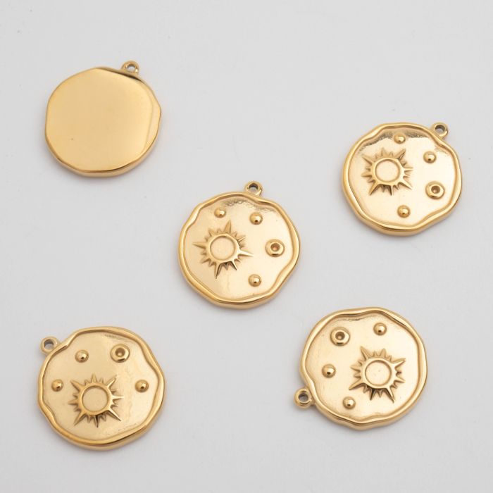 Dlaczego warto wybrać tę zawieszkę?• Wykonana z stal chirurgiczna w kolorze złotym, pozłacana metodą PVD – trwała i starannie wykończona.• Rozmiar 17 mm – dopasowany do naszyjników, bransoletek i kolczyków.• Kształt kółko nieregularne ze słońcem i planetami – symboliczny i ponadczasowy.• Uniwersalny styl – pasuje do biżuterii codziennej i na specjalne okazje.• Łatwa w użyciu – idealna także dla osób początkujących w handmade.