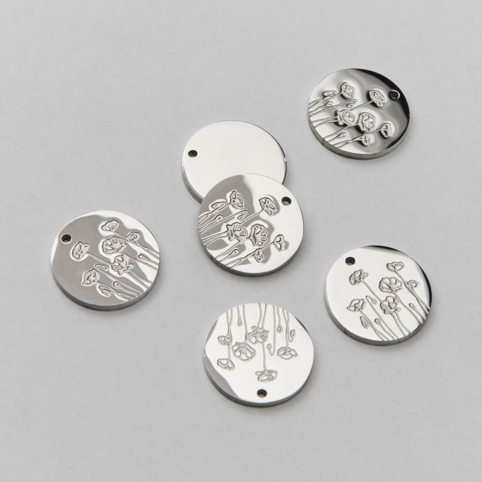 Zawieszka ze stali chirurgicznej kółko z grawerem kwiatów maków w kolorze srebrnym 13mm