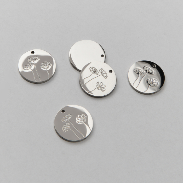 Zawieszka ze stali chirurgicznej kółko z grawerem kwiatu kosmosu w kolorze srebrnym 13mmTo trwały element biżuterii lub półfabrykat jubilerski, który dobrze sprawdza się w codziennych realizacjach. W biżuterii handmade stal chirurgiczna 316L jest ceniona za dobry wygląd, odporność na korozję i wygodę codziennego użytkowania.Zawieszka ze stali chirurgicznej 316L to dekoracyjny element, który nadaje biżuterii charakteru i pozwala tworzyć spersonalizowane projekty. Świetnie sprawdza się w naszyjnikach, bransoletkach, kolczykach oraz drobnych charmsach.Forma lub motyw