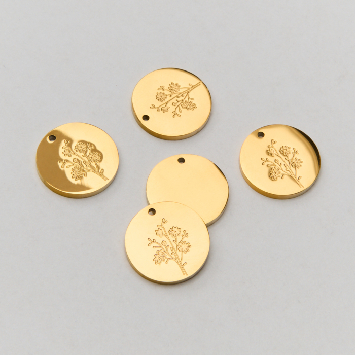 Zawieszka ze stali chirurgicznej kółko z grawerem kwiaty rumianku w kolorze złotym 13mm PVDTo estetyczny element biżuteryjny ze stali chirurgicznej 316L, chętnie wybierany do nowoczesnych projektów. To materiał chętnie wybierany do biżuterii handmade ze względu na trwałość, estetykę i wygodę użytkowania. Wykończenie w kolorze złotym uzyskane metodą PVD.Zawieszka ze stali chirurgicznej 316L to dekoracyjny element, który nadaje biżuterii charakteru i pozwala tworzyć spersonalizowane projekty. Świetnie sprawdza się w naszyjnikach, bransoletkach, kolczykach oraz drobnych charmsach.Forma lub motyw