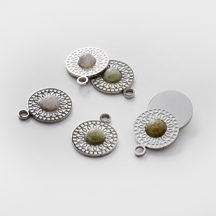Zawieszka ze stali chirurgicznej kółko z labradorytem w kolorze srebrnym 19mmTo trwały element biżuterii lub półfabrykat jubilerski, który dobrze sprawdza się w codziennych realizacjach. Stal chirurgiczna 316L dobrze sprawdza się w biżuterii noszonej na co dzień, ponieważ łączy trwałość z estetycznym wykończeniem.Zawieszka ze stali chirurgicznej 316L to dekoracyjny element, który nadaje biżuterii charakteru i pozwala tworzyć spersonalizowane projekty. Świetnie sprawdza się w naszyjnikach, bransoletkach, kolczykach oraz drobnych charmsach.Forma lub motyw