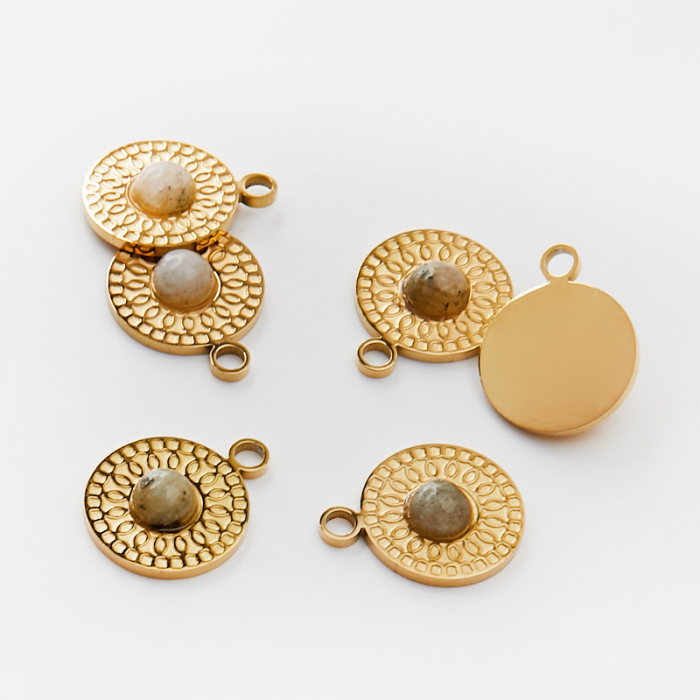 Zawieszka ze stali chirurgicznej kółko z labradorytem w kolorze złotym 19mm PVDTo trwały element biżuterii lub półfabrykat jubilerski, który dobrze sprawdza się w codziennych realizacjach. Stal chirurgiczna 316L jest ceniona za odporność na korozję i estetyczny wygląd w codziennym użytkowaniu. Wykończenie w kolorze złotym uzyskane metodą PVD.Zawieszka ze stali chirurgicznej 316L to dekoracyjny element, który nadaje biżuterii charakteru i pozwala tworzyć spersonalizowane projekty. Świetnie sprawdza się w naszyjnikach, bransoletkach, kolczykach oraz drobnych charmsach.Forma lub motyw
