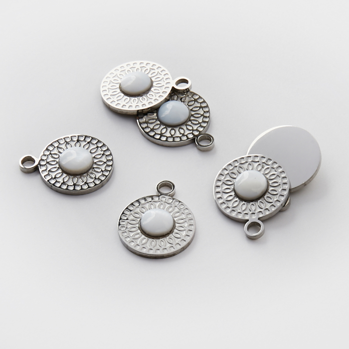 Zawieszka ze stali chirurgicznej kółko z masą perłową w kolorze srebrnym 19mmTo dopracowany produkt ze stali chirurgicznej 316L, który łączy praktyczność z estetycznym wyglądem. Stal chirurgiczna 316L jest ceniona za odporność na korozję i estetyczny wygląd w codziennym użytkowaniu.Zawieszka ze stali chirurgicznej 316L to dekoracyjny element, który nadaje biżuterii charakteru i pozwala tworzyć spersonalizowane projekty. Świetnie sprawdza się w naszyjnikach, bransoletkach, kolczykach oraz drobnych charmsach.Forma lub motyw
