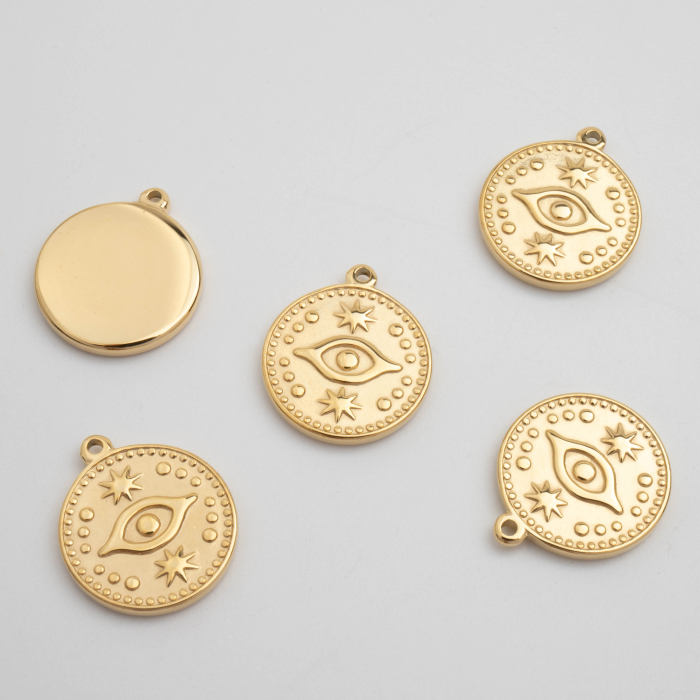 Zawieszka ze stali chirurgicznej kółko z okiem proroka w kolorze złotym 19,5mm PVDTo estetyczny element biżuteryjny ze stali chirurgicznej 316L, chętnie wybierany do nowoczesnych projektów. W biżuterii handmade stal chirurgiczna 316L jest ceniona za dobry wygląd, odporność na korozję i wygodę codziennego użytkowania. Wykończenie w kolorze złotym uzyskane metodą PVD.Zawieszka ze stali chirurgicznej 316L to dekoracyjny element, który nadaje biżuterii charakteru i pozwala tworzyć spersonalizowane projekty. Świetnie sprawdza się w naszyjnikach, bransoletkach, kolczykach oraz drobnych charmsach.Forma lub motyw