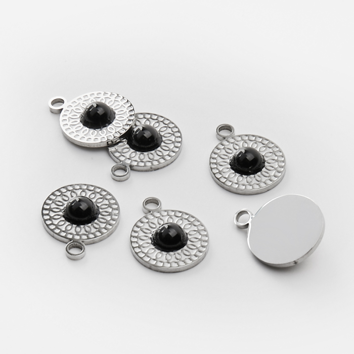 Zawieszka ze stali chirurgicznej kółko z onyksem w kolorze srebrnym 19mmTo dopracowany produkt ze stali chirurgicznej 316L, który łączy praktyczność z estetycznym wyglądem. Stal chirurgiczna 316L dobrze sprawdza się w biżuterii noszonej na co dzień, ponieważ łączy trwałość z estetycznym wykończeniem.Zawieszka ze stali chirurgicznej 316L to dekoracyjny element, który nadaje biżuterii charakteru i pozwala tworzyć spersonalizowane projekty. Świetnie sprawdza się w naszyjnikach, bransoletkach, kolczykach oraz drobnych charmsach.Forma lub motyw