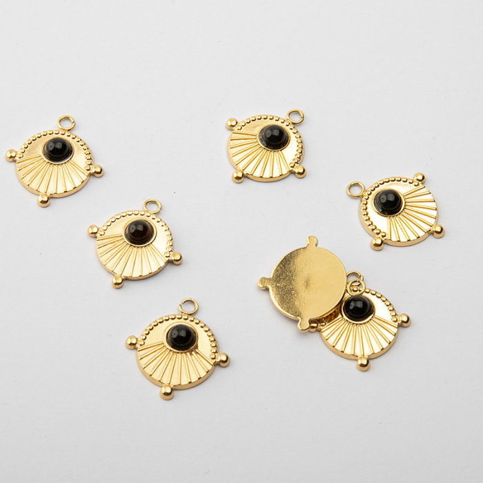 Zawieszka ze stali chirurgicznej kółko z wypustkami onyksem w kolorze złotym 17,5mm PVDTo starannie wykonany produkt ze stali chirurgicznej 316L, który dobrze prezentuje się w codziennym użytkowaniu. Stal chirurgiczna 316L jest ceniona za odporność na korozję i estetyczny wygląd w codziennym użytkowaniu. Wykończenie w kolorze złotym uzyskane metodą PVD.Zawieszka ze stali chirurgicznej 316L to dekoracyjny element, który nadaje biżuterii charakteru i pozwala tworzyć spersonalizowane projekty. Świetnie sprawdza się w naszyjnikach, bransoletkach, kolczykach oraz drobnych charmsach.Forma lub motyw
