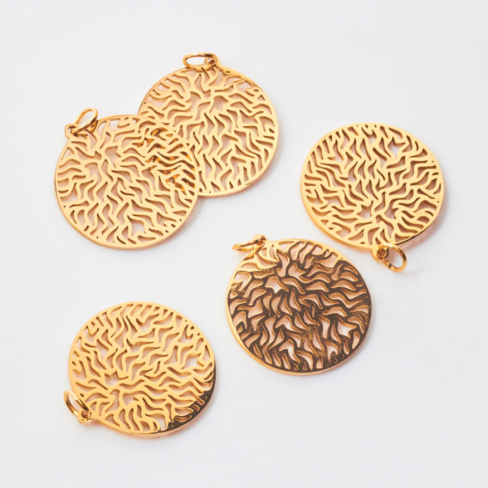 Zawieszka ze stali chirurgicznej koło ze wzorkami do naszyjników w kolorze złotym 22mmTo trwały element biżuterii lub półfabrykat jubilerski, który dobrze sprawdza się w codziennych realizacjach. To materiał chętnie wybierany do biżuterii handmade ze względu na trwałość, estetykę i wygodę użytkowania.Naszyjnik ze stali chirurgicznej 316L to gotowy element biżuterii lub baza do dalszego personalizowania, w zależności od konstrukcji produktu. Dobrze sprawdza się w codziennym noszeniu i pozwala łatwo dopasować styl projektu do pozostałych dodatków.Rozmiar