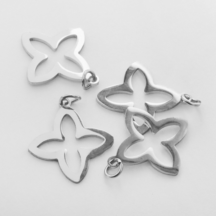 Zawieszka ze stali chirurgicznej koniczynka marokańska w kolorze srebrnym 24mmTo estetyczny element biżuteryjny ze stali chirurgicznej 316L, chętnie wybierany do nowoczesnych projektów. W biżuterii handmade stal chirurgiczna 316L jest ceniona za dobry wygląd, odporność na korozję i wygodę codziennego użytkowania.Zawieszka ze stali chirurgicznej 316L to dekoracyjny element, który nadaje biżuterii charakteru i pozwala tworzyć spersonalizowane projekty. Świetnie sprawdza się w naszyjnikach, bransoletkach, kolczykach oraz drobnych charmsach.Forma lub motyw
