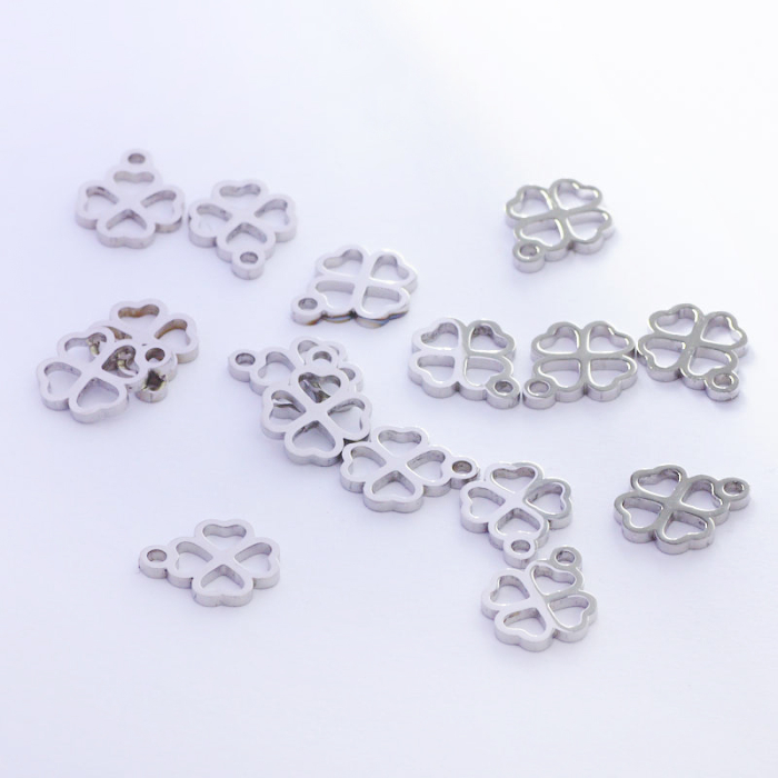 Zawieszka ze stali chirurgicznej koniczynka w kolorze srebrnym 10,5mmTo trwały element biżuterii lub półfabrykat jubilerski, który dobrze sprawdza się w codziennych realizacjach. To materiał chętnie wybierany do biżuterii handmade ze względu na trwałość, estetykę i wygodę użytkowania.Zawieszka ze stali chirurgicznej 316L to dekoracyjny element, który nadaje biżuterii charakteru i pozwala tworzyć spersonalizowane projekty. Świetnie sprawdza się w naszyjnikach, bransoletkach, kolczykach oraz drobnych charmsach.Forma lub motyw