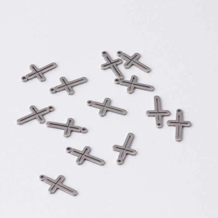 Zawieszka ze stali chirurgicznej krzyż w kolorze srebrnym 13x8To dopracowany produkt ze stali chirurgicznej 316L, który łączy praktyczność z estetycznym wyglądem. W biżuterii handmade stal chirurgiczna 316L jest ceniona za dobry wygląd, odporność na korozję i wygodę codziennego użytkowania.Zawieszka ze stali chirurgicznej 316L to dekoracyjny element, który nadaje biżuterii charakteru i pozwala tworzyć spersonalizowane projekty. Świetnie sprawdza się w naszyjnikach, bransoletkach, kolczykach oraz drobnych charmsach.Forma lub motyw
