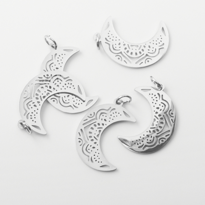 Zawieszka ze stali chirurgicznej księżyc ażurowy w kolorze srebrnym 22mmTo estetyczny element biżuteryjny ze stali chirurgicznej 316L, chętnie wybierany do nowoczesnych projektów. Stal chirurgiczna 316L dobrze sprawdza się w biżuterii noszonej na co dzień, ponieważ łączy trwałość z estetycznym wykończeniem.Zawieszka ze stali chirurgicznej 316L to dekoracyjny element, który nadaje biżuterii charakteru i pozwala tworzyć spersonalizowane projekty. Świetnie sprawdza się w naszyjnikach, bransoletkach, kolczykach oraz drobnych charmsach.Forma lub motyw