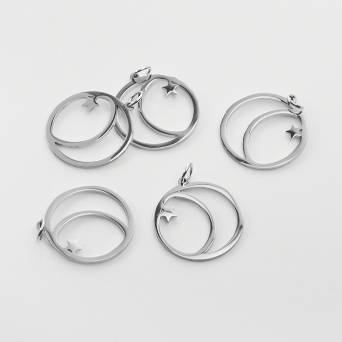 Zawieszka ze stali chirurgicznej księżyc i gwiazdka w kółku do naszyjników w kolorze srebrnym 22mmTo estetyczny element biżuteryjny ze stali chirurgicznej 316L, chętnie wybierany do nowoczesnych projektów. W biżuterii handmade stal chirurgiczna 316L jest ceniona za dobry wygląd, odporność na korozję i wygodę codziennego użytkowania.Naszyjnik ze stali chirurgicznej 316L to gotowy element biżuterii lub baza do dalszego personalizowania, w zależności od konstrukcji produktu. Dobrze sprawdza się w codziennym noszeniu i pozwala łatwo dopasować styl projektu do pozostałych dodatków.Rozmiar