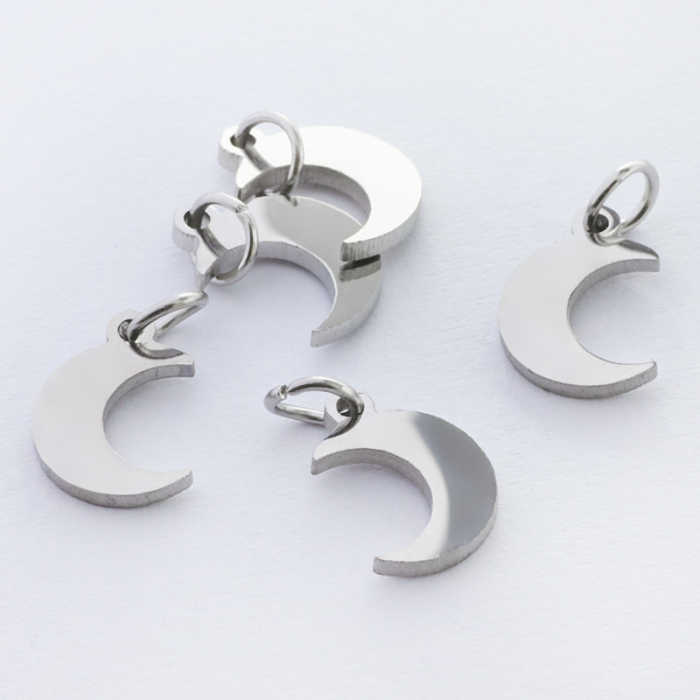 Zawieszka ze stali chirurgicznej księżyc kolor w kolorze srebrnym 8,5mmTo estetyczny element biżuteryjny ze stali chirurgicznej 316L, chętnie wybierany do nowoczesnych projektów. Stal chirurgiczna 316L dobrze sprawdza się w biżuterii noszonej na co dzień, ponieważ łączy trwałość z estetycznym wykończeniem.Zawieszka ze stali chirurgicznej 316L to dekoracyjny element, który nadaje biżuterii charakteru i pozwala tworzyć spersonalizowane projekty. Świetnie sprawdza się w naszyjnikach, bransoletkach, kolczykach oraz drobnych charmsach.Forma lub motyw