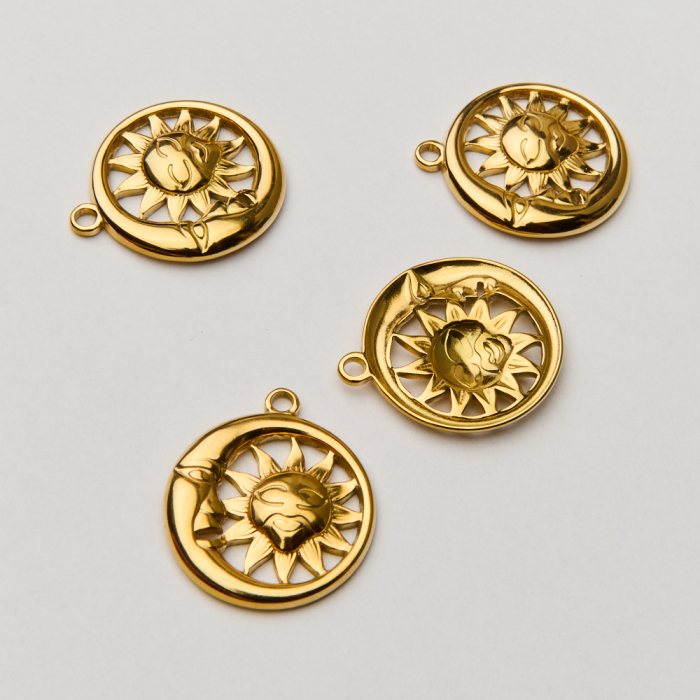 Zawieszka ze stali chirurgicznej księżyc ze słońcem w kolorze złotym 25mm PVDTo starannie wykonany produkt ze stali chirurgicznej 316L, który dobrze prezentuje się w codziennym użytkowaniu. To materiał chętnie wybierany do biżuterii handmade ze względu na trwałość, estetykę i wygodę użytkowania. Wykończenie w kolorze złotym uzyskane metodą PVD.Zawieszka ze stali chirurgicznej 316L to dekoracyjny element, który nadaje biżuterii charakteru i pozwala tworzyć spersonalizowane projekty. Świetnie sprawdza się w naszyjnikach, bransoletkach, kolczykach oraz drobnych charmsach.Forma lub motyw