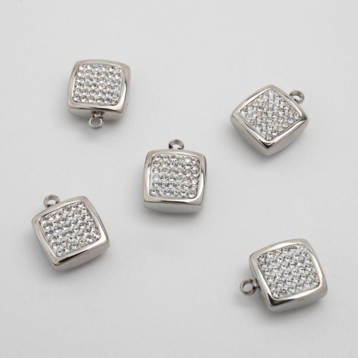 Zawieszka ze stali chirurgicznej kwadrat wysadzany cyrkoniami w kolorze srebrnym 12mmTo estetyczny element biżuteryjny ze stali chirurgicznej 316L, chętnie wybierany do nowoczesnych projektów. W biżuterii handmade stal chirurgiczna 316L jest ceniona za dobry wygląd, odporność na korozję i wygodę codziennego użytkowania.Zawieszka ze stali chirurgicznej 316L to dekoracyjny element, który nadaje biżuterii charakteru i pozwala tworzyć spersonalizowane projekty. Świetnie sprawdza się w naszyjnikach, bransoletkach, kolczykach oraz drobnych charmsach.Forma lub motyw