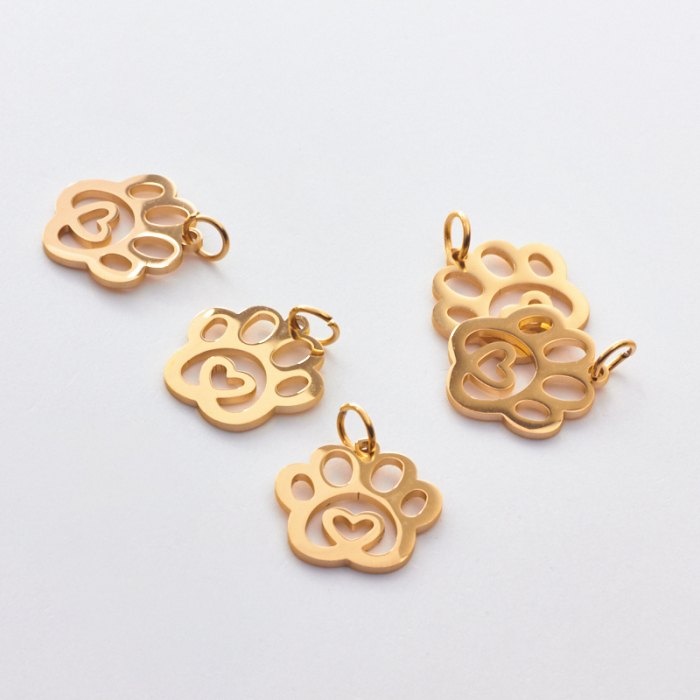 Zawieszka ze stali chirurgicznej łapka psa z serduszkiem w kolorze złotym 14mmTo dopracowany produkt ze stali chirurgicznej 316L, który łączy praktyczność z estetycznym wyglądem. W biżuterii handmade stal chirurgiczna 316L jest ceniona za dobry wygląd, odporność na korozję i wygodę codziennego użytkowania.Zawieszka ze stali chirurgicznej 316L to dekoracyjny element, który nadaje biżuterii charakteru i pozwala tworzyć spersonalizowane projekty. Świetnie sprawdza się w naszyjnikach, bransoletkach, kolczykach oraz drobnych charmsach.Forma lub motyw