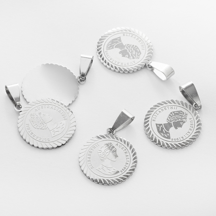 Zawieszka ze stali chirurgicznej moneta królowa Elżbieta II w kolorze srebrnym 20mmTo trwały element biżuterii lub półfabrykat jubilerski, który dobrze sprawdza się w codziennych realizacjach. W biżuterii handmade stal chirurgiczna 316L jest ceniona za dobry wygląd, odporność na korozję i wygodę codziennego użytkowania.Zawieszka ze stali chirurgicznej 316L to dekoracyjny element, który nadaje biżuterii charakteru i pozwala tworzyć spersonalizowane projekty. Świetnie sprawdza się w naszyjnikach, bransoletkach, kolczykach oraz drobnych charmsach.Forma lub motyw