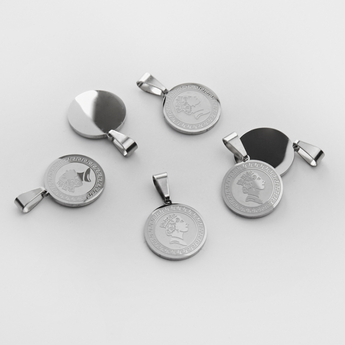 Zawieszka ze stali chirurgicznej moneta z Królową Elżbietą w kolorze srebrnym 16,5mmTo estetyczny element biżuteryjny ze stali chirurgicznej 316L, chętnie wybierany do nowoczesnych projektów. Stal chirurgiczna 316L dobrze sprawdza się w biżuterii noszonej na co dzień, ponieważ łączy trwałość z estetycznym wykończeniem.Zawieszka ze stali chirurgicznej 316L to dekoracyjny element, który nadaje biżuterii charakteru i pozwala tworzyć spersonalizowane projekty. Świetnie sprawdza się w naszyjnikach, bransoletkach, kolczykach oraz drobnych charmsach.Forma lub motyw