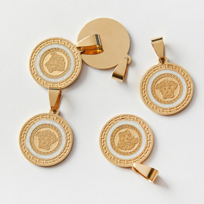 Zawieszka ze stali chirurgicznej moneta z Medusą i białą emalią w kolorze złotym 20mm PVDTo estetyczny element biżuteryjny ze stali chirurgicznej 316L, chętnie wybierany do nowoczesnych projektów. W biżuterii handmade stal chirurgiczna 316L jest ceniona za dobry wygląd, odporność na korozję i wygodę codziennego użytkowania. Wykończenie w kolorze złotym uzyskane metodą PVD.Zawieszka ze stali chirurgicznej 316L to dekoracyjny element, który nadaje biżuterii charakteru i pozwala tworzyć spersonalizowane projekty. Świetnie sprawdza się w naszyjnikach, bransoletkach, kolczykach oraz drobnych charmsach.Forma lub motyw