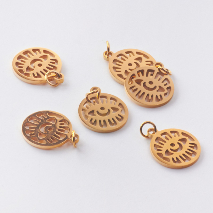 Zawieszka ze stali chirurgicznej oko proroka w kolorze złotym 14mmTo dopracowany produkt ze stali chirurgicznej 316L, który łączy praktyczność z estetycznym wyglądem. Stal chirurgiczna 316L dobrze sprawdza się w biżuterii noszonej na co dzień, ponieważ łączy trwałość z estetycznym wykończeniem.Zawieszka ze stali chirurgicznej 316L to dekoracyjny element, który nadaje biżuterii charakteru i pozwala tworzyć spersonalizowane projekty. Świetnie sprawdza się w naszyjnikach, bransoletkach, kolczykach oraz drobnych charmsach.Forma lub motyw