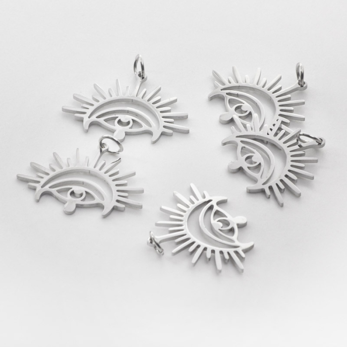Zawieszka ze stali chirurgicznej oko proroka ze słońcem w kolorze srebrnym 19,5mmTo estetyczny element biżuteryjny ze stali szlachetnej, chętnie wybierany do nowoczesnych projektów. W biżuterii handmade stal szlachetna jest ceniona za dobry wygląd, odporność na korozję i wygodę codziennego użytkowania.Zawieszka ze stali szlachetnej to dekoracyjny element, który nadaje biżuterii charakteru i pozwala tworzyć spersonalizowane projekty. Świetnie sprawdza się w naszyjnikach, bransoletkach, kolczykach oraz drobnych charmsach.Forma lub motyw